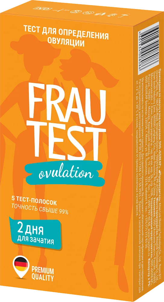 FRAUTEST Ovulation — Набор из 5 тест-полосок. Тест представляет собой пропитанную реагентом (мечеными антителами к ЛГ) бумажную полоску, которую на 10 секунд погружают в емкость с мочой. Смотрите и пробуйте FRAUTEST Express — Тест-полоску.